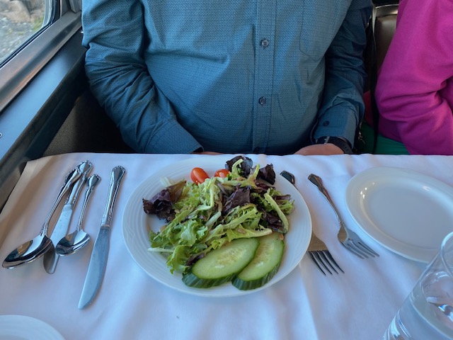 Meals include breakfast, lunch, and dinner. Breakfast is open seating, with an additional continental breakfast available in the Skyline car. Lunch and dinner are served in two or three seatings, usually chosen the previous evening.