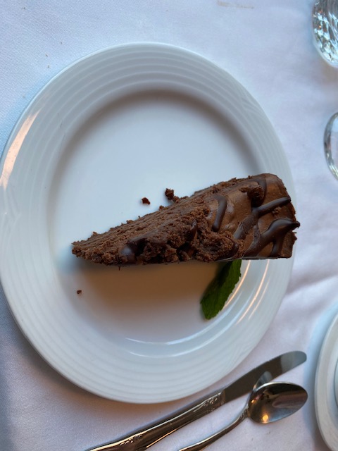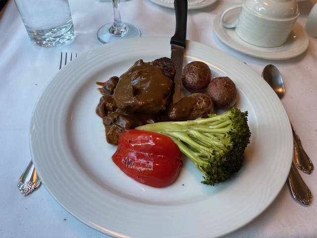 Dinner offered beef tenderloin, trout fillet, chicken with pesto cream or a broccoli stir fry. The soup option was a minestrone. For dessert the choices were doble de leche cheesecake or triple chocolate fudge cake.