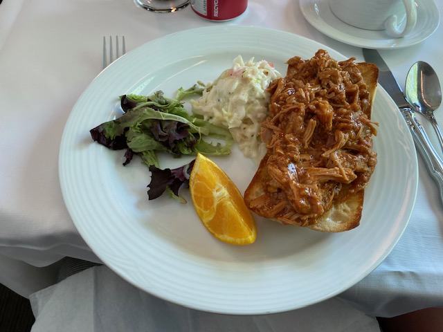 First lunch offered a pulled pork sandwich, shrimp and scallop skewer, pasta of the day or a veggie burger. The soup was a vegetable soup. The dessert options were chocolate ice cream or carrot pecan cake.
