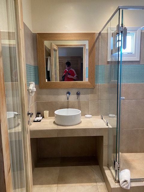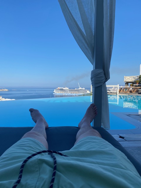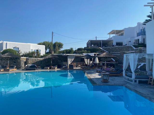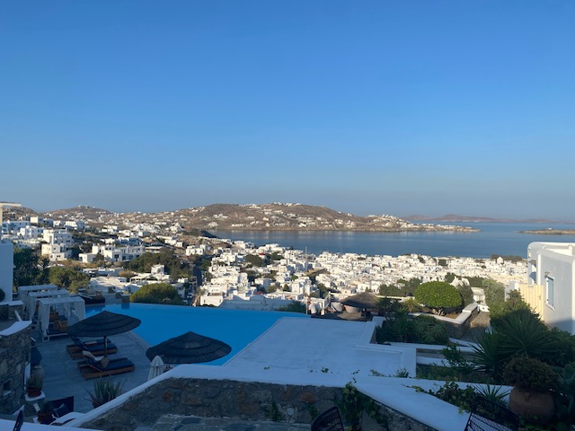 We stumbled upon Mykonos Town Vencia Boutique Hotel on Booking. A four-star hotel with pool but no gym fit our bill. Five-star hotels were (are) too expensive and Vencia just looked really nice.