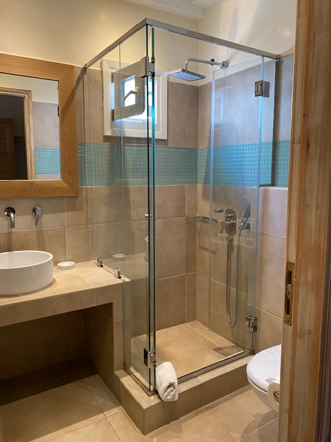 The shower is nice and practical. The bathroom could use a few improvements. More hooks and bars to dry the many towels provided. And the sink doesn’t drain the water well. It’s always wet. As in, if you throw your towel in there, it will be soaked.