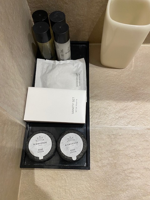 One shower, one sink. Toiletries by Bienvenue Paris. No dispenser, but classic bottles of shower gel and shampoo.