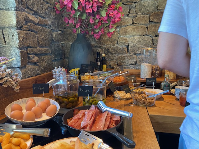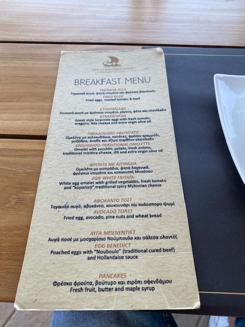 The buffet offers the predictable bread options, cold cuts, (Greek and local) cheeses, yoghurts, salad items, fruit, juices and water. As Mykonos is in Greece, there are quite a few pastry options.