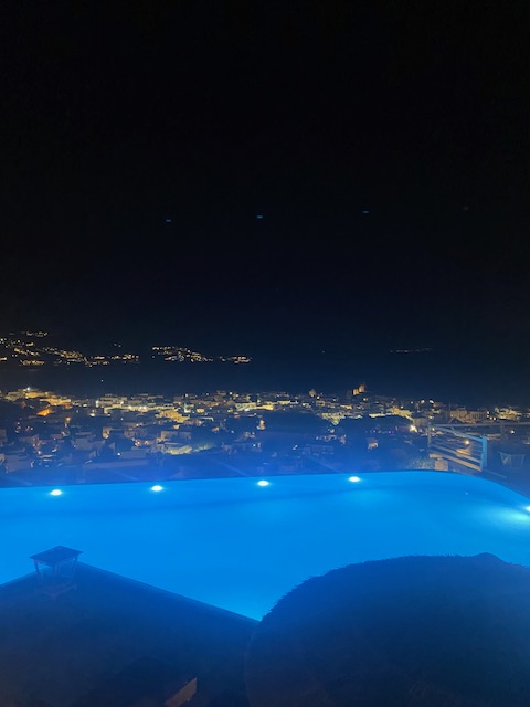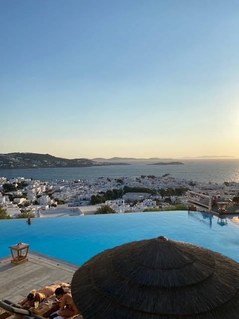 The pool is not large but substantial. Beware, it gets deeper when nearing the infinity edge townside. The pool offers a magnificent view on Mykonos Town, the bay and the Aegean Sea. There are quite a few sun beds and lounge chairs of different type.