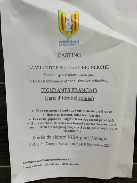 The City of Perpignan calls for “European types” extras, “preferably blonde and wit blue eyes” for a rally about refugees. “Nostalgics of French Algeria get a preference”, it says. “If you are really tanned and with brown eyes or an actual refugee from Syria, please abstain.”