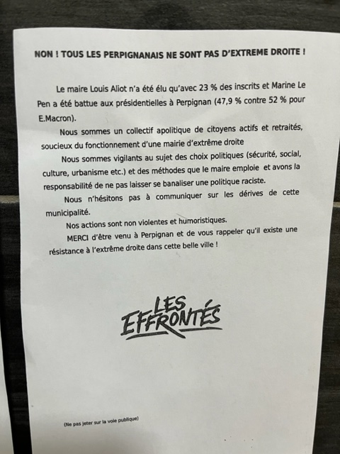 Perpignan has a extreme right-wing government, led by Louis Aliot of Rassemblement National. Oriol saw a casting sheet in a café toilet illustrating what this means.