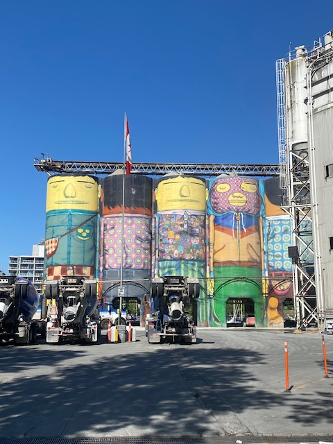 Not to be missed are the silos. Six towers, each some 21 meter tall, now feature a colorful crew of giants. Half of them face the boats on False Creek, and the other three look inward, towards the Ocean Concrete plant.