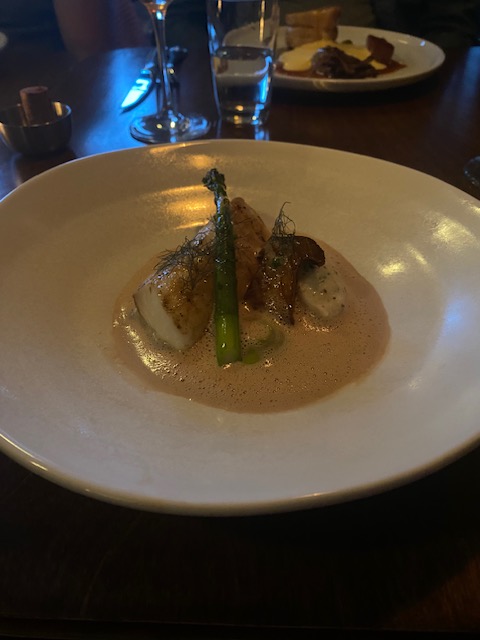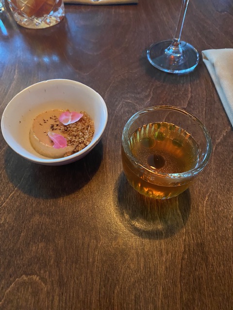 We started off with a chicken consommé with a duck mousse. This was followed by home-made bread with butter and rillette. The official title was: whole red spring wheat bun, maple-rosemary smoked salt with cretons; foie gras custard, brown butter bread crumb, maple syrup, chicken consommé.