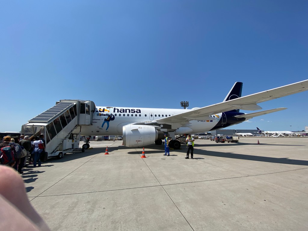 The bus brought us out to the remote stand where our Airbus A319 sporting the special Lu livery was standing. It was nice to have a special livery instead of a bog standard Lufthansa A320 series aircraft. They even went as far as to paint some images on the wings too, I tried to take a picture of it but it was difficult to get a good shot (some things are just better seen with your own eyes).