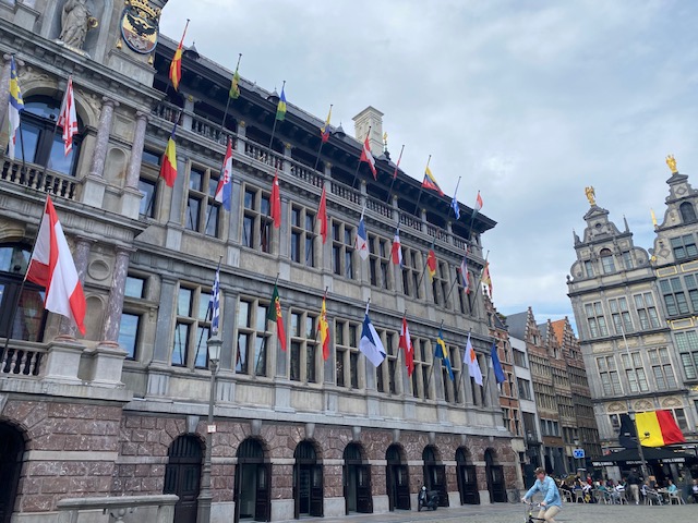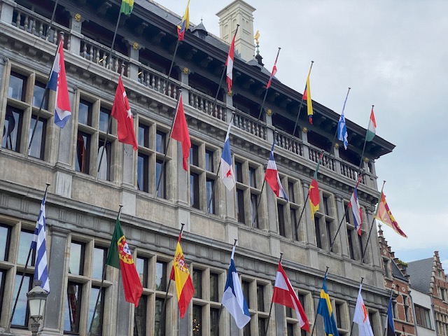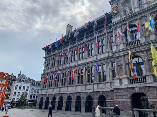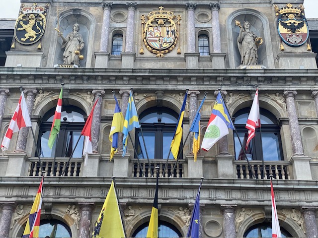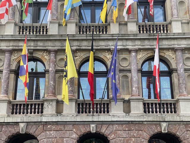 Belgium is in the epicentre. Mayor Bart De Wever (N-VA) may not be the biggest fan of the Belgian flag, but he respects the protocol. On the left you have the flag of Flanders, on the right the EU flag. More left the chequered provincial flag and more the right the city flag. Not to be confused with the ‘Beaming A’, the corporate logo of the city government.
