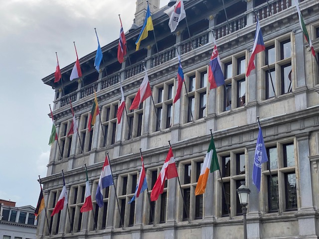On the first storey, left and right from the centre, you’ll see the flags of the melber states of European Union in the order in which they joined. Probably to compensate for for Brexit, the United Kingdom has been replaced by the United Nations.