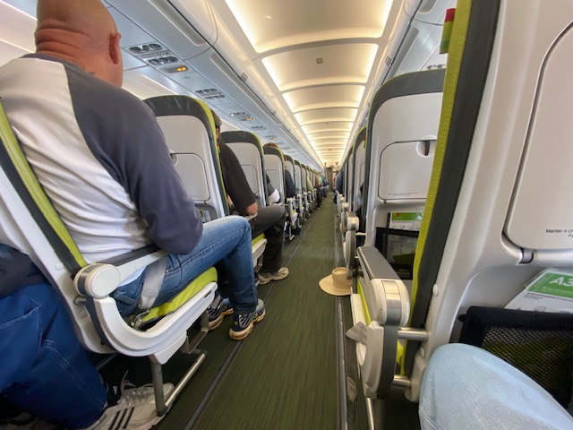 We had seats with green headrests. Thez seats are very basic, a very small amount of padding. They’re hard and and there’s very little legroom. I can’t say it’s (very) comfortable. But this is standard nowadays on short-haul flights.