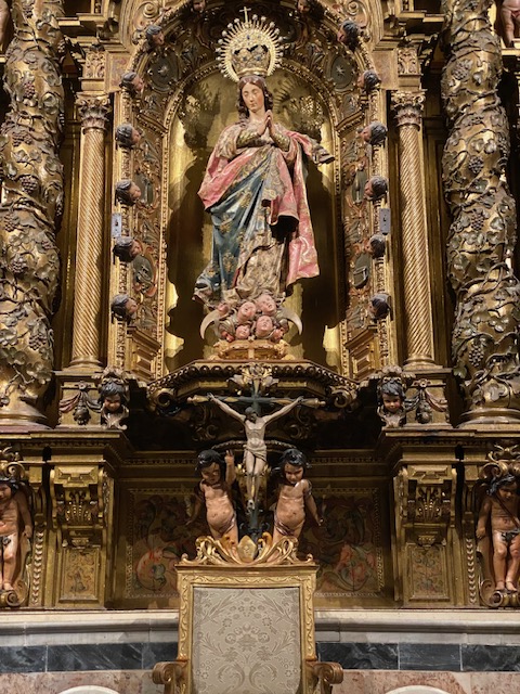 The central figure is a majestic image of the Assumption of the Virgin Mary. This retablo is a prime example of the skill of Seville’s craftsmen, who created an elaborate and visually stunning piece of religious art.