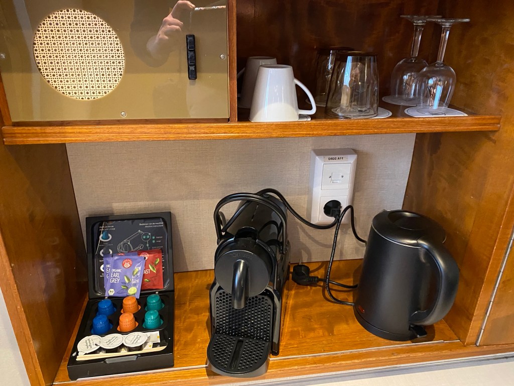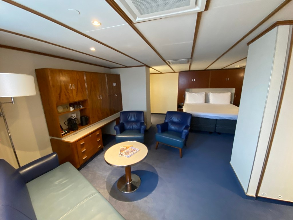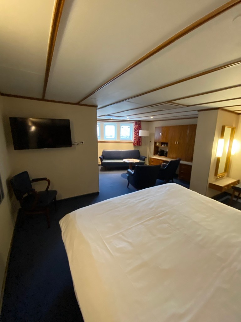 By this time it was 15:00 and our rooms where ready for check-in. Sam had chosen to book the Executive rooms, these where former Officer quarters at the front of the ship and where mostly in the original 1959 state. They featured a spacious lounge area with some nice seats, also a huge cupboard where you also could find the coffee and tea facilities. Unfortunately we found some garbage and used handkerchiefs behind one of the doors which housekeeping missed when cleaning the room.