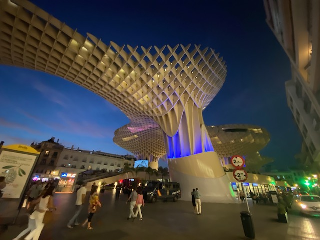 The Setas de Sevilla (Mushrooms of Seville) or Las Setas (The Mushrooms), initially titled Metropol Parasol, is a large, predominantly wood structure located at Plaza de la Encarnación in the old quarter of Seville. It accommodates a traditional market, restaurants, a performance square, archaeological museum — and ‘rooftop’ terrace with a panoramic view of Seville’s old city.