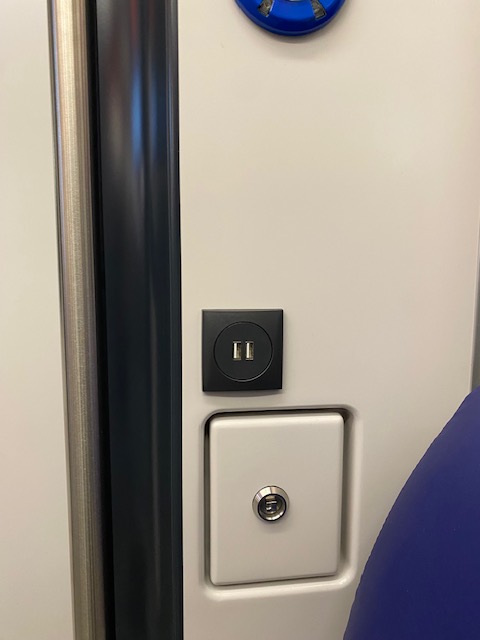 The second class seats are blue and in a 2+2 configuration. Some seats are looking at each other, others don’t. There’s one power socket and USB-A port per two seats. Some seats are like a little sofa. There are several locations for larger luggage.
