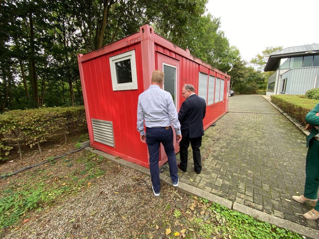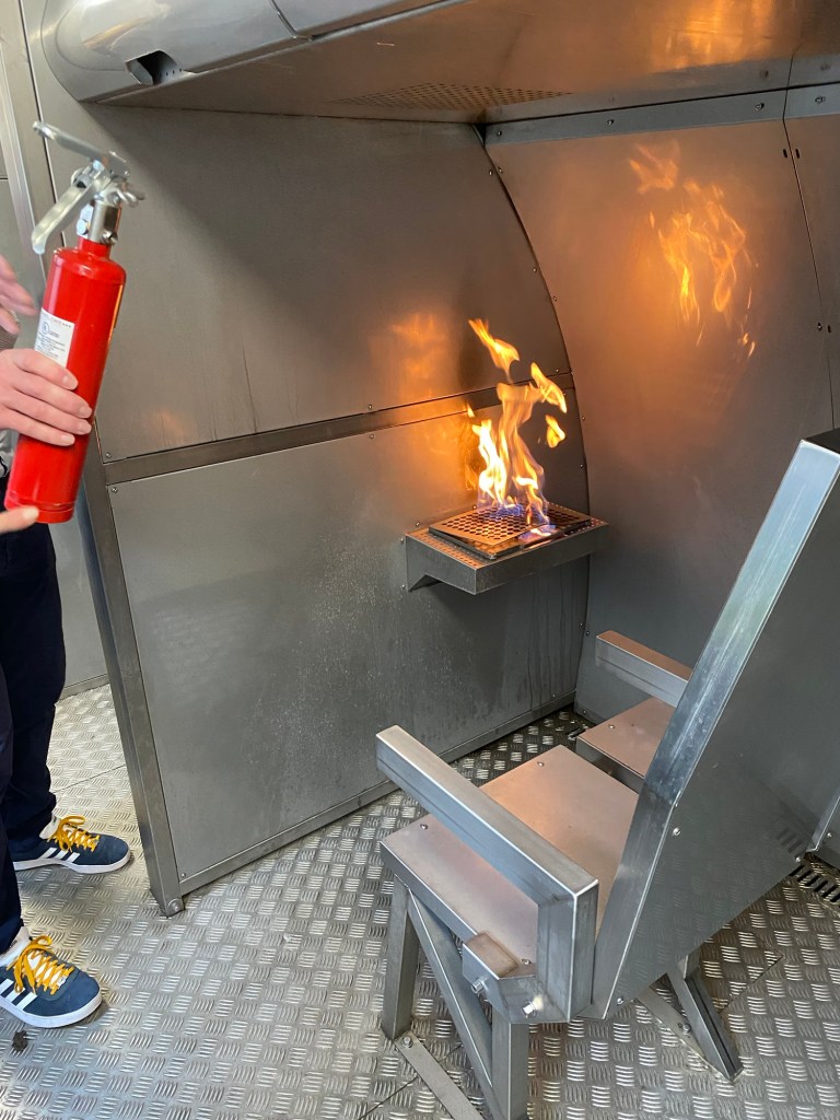 Outside in the backyard was a red container, this was the fire trainer. Here they could simulate all kinds of fires and how to extinguish them. They also kindly showed us an example. The fire trainer was provided by TUIfly Belgium as part of their partnership with the training centre.