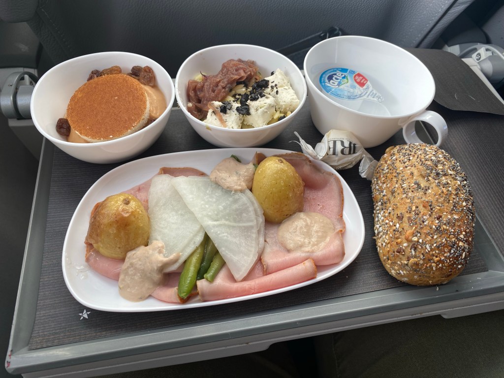 The crew also came around with freshly baked warm bread and later during the meal came offering seconds, a very nice touch! Along with the meal we were offered drinks, I selected a nice white wine while Timothy went for his all-time favourite, water.