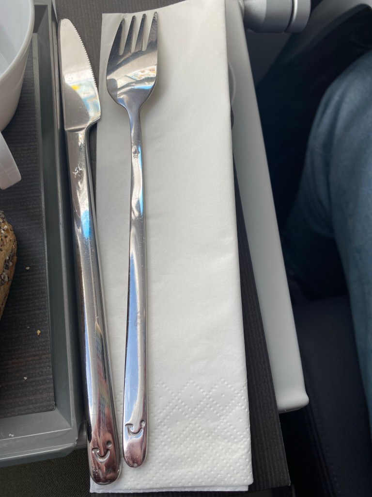 A bit later as the cabin was being filled with the smell of freshly baked bread the purser first handed out some paper wrappings containing the metal cutlery (nicely engraved with the TUI logo).