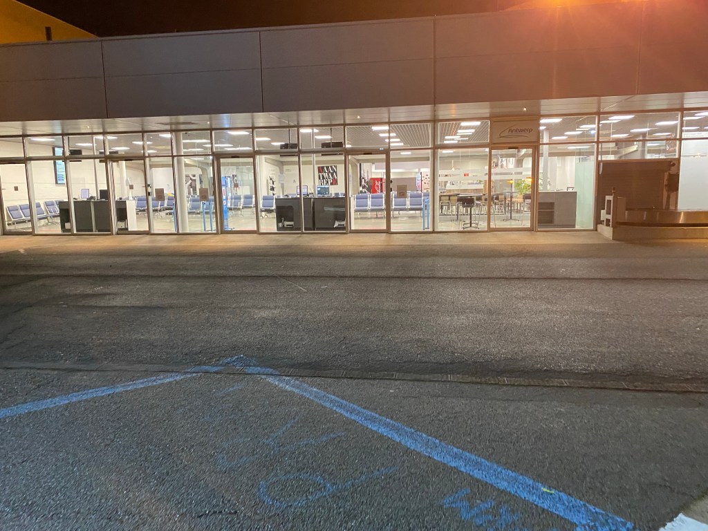 As soon as the sun started to set we started our descent into Antwerp. Whit the darkness below us it was difficult to assess where exactly we were, but after a while we determined we overflew Dendermonde, turned over Boom to make our final approach over Kontich and Borsbeek into Antwerp Airport.