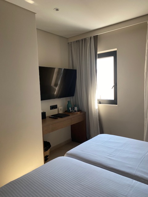The room is relatively large and features two beds, a desk (the chair needs to be moved from the door to the desk), coffee and tea making facilities and air conditioning.
