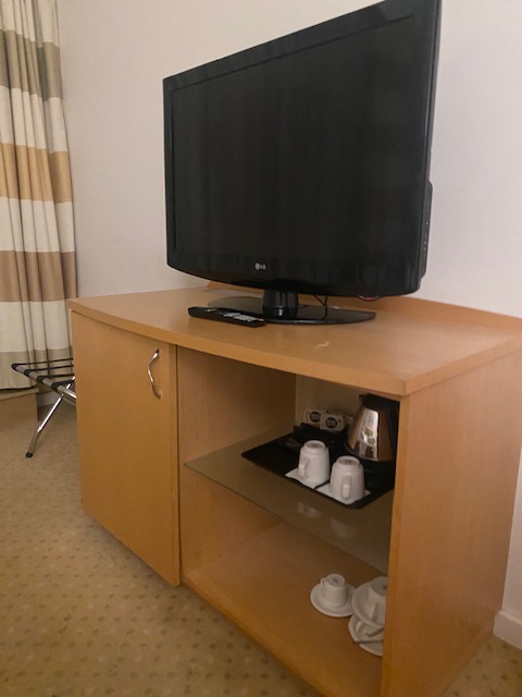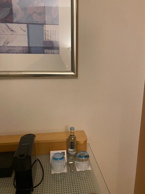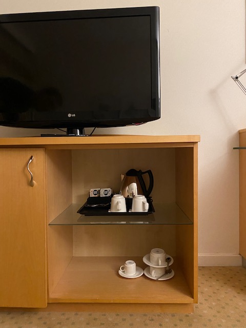 The room, marketed on Booking as ‘Room with Kingsize Bed‘, is fairly spacious. It features one kingsize bed, with two German style folded duvets. A television, a desk, an armchair, a Nespresso machine and a kettle for tea. An empty fridge, storage room. An assistant in the form of a tablet. There are a lot of cup and glasses options, which is nice.