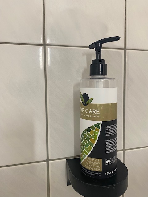 The cosmetics are branded Olive Care and are fixed in dispensers. There’s hand soap and lotion, and a shampoo – shower gel combination.