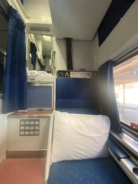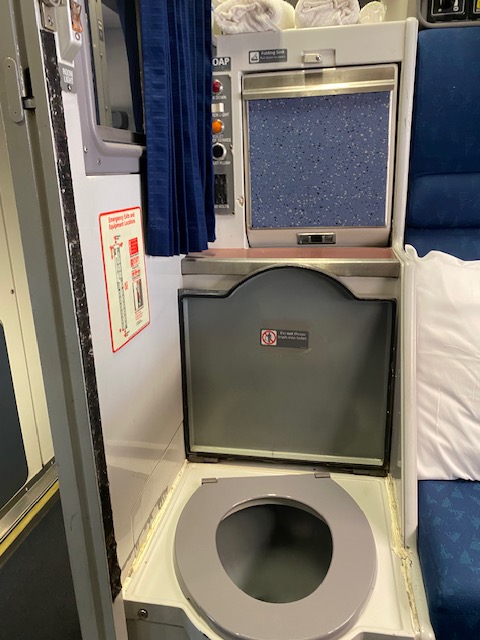 The seats are really comfortable. But if we had been two in the roomette, it would have been cramped. Being solo meant we could put our feet up. Also, sharing the toilet would have been annoying at times, certainly during the night. There is no extra toilet in the sleeping car.