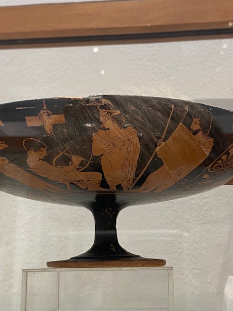 Among the finds from Mykonos, is the impressive ‘Pithos of Mykonos‘ (‘Πίθος της Μυκόνου’): a large jar, (made in a workshop in Tinos or Τήνος in the 7th century B.C.) Richly decorated with embossed pictures depicting various scenes from the Trojan War, it is truly magnificent. (In the centre the Achaean warriors with the Trojan Horse are depicted).