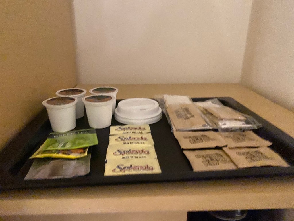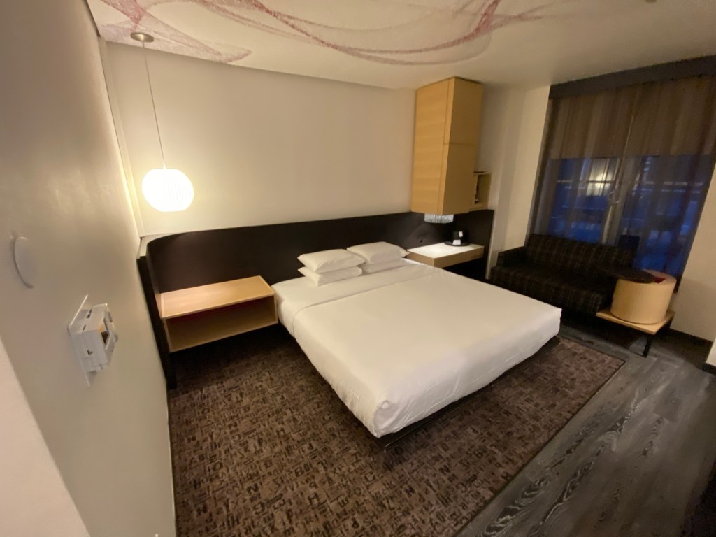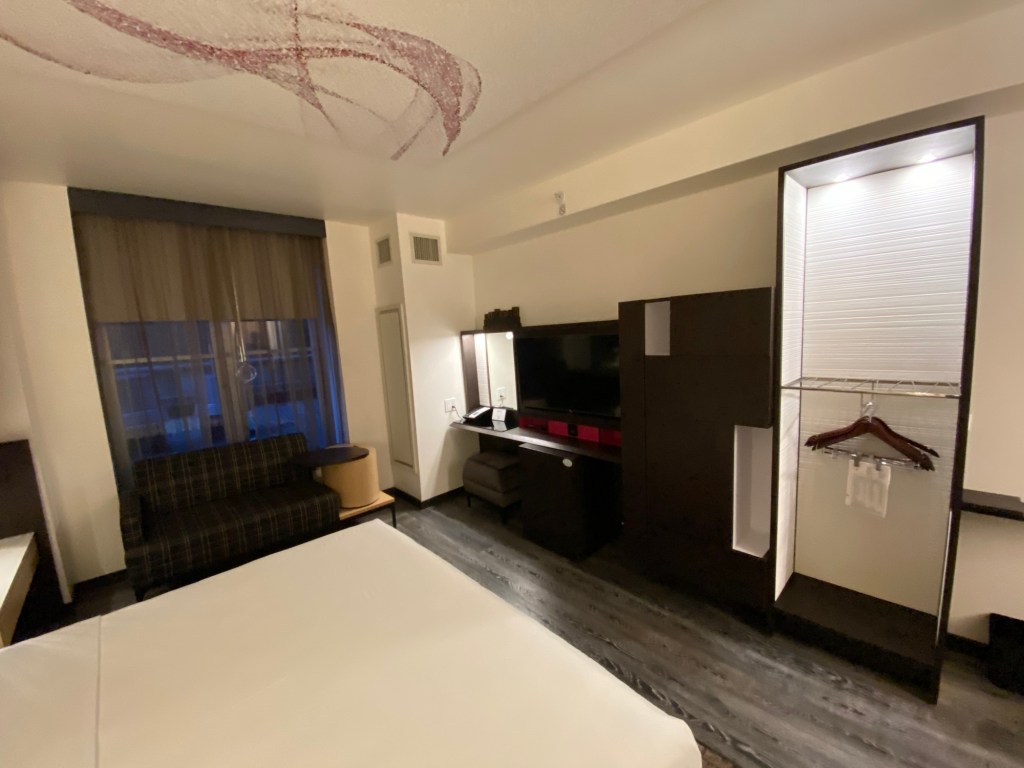 The hotel is located in a rather grey providing a bit of a forecourt. Inside the lobby was much more welcoming and colourful. Upon entering you could immediately smell a nice scent. As we arrived quite late the clerk helped us immediately for check-in, however as he was still new we had to wait for his supervisor to appear as our booking was apparently a bit more complicated than a standard booking. In the end we received our room keys and a (paid) late check-out of 15:00 (as our flight left JFK late).