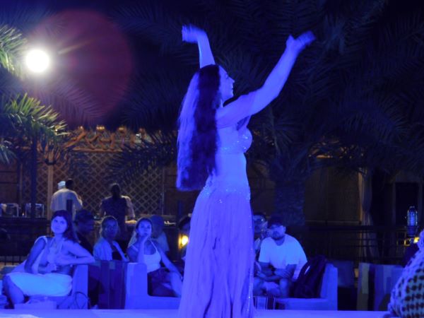 Then you are driven to a panoramic point where you can take pictures of the setting sun. In the dark you are driven to a camp where you are treated to an evening show with dancers and a fire artist. Within the price of the package I could enjoy a barbecue, a salad buffet and coffee and sodas at will.