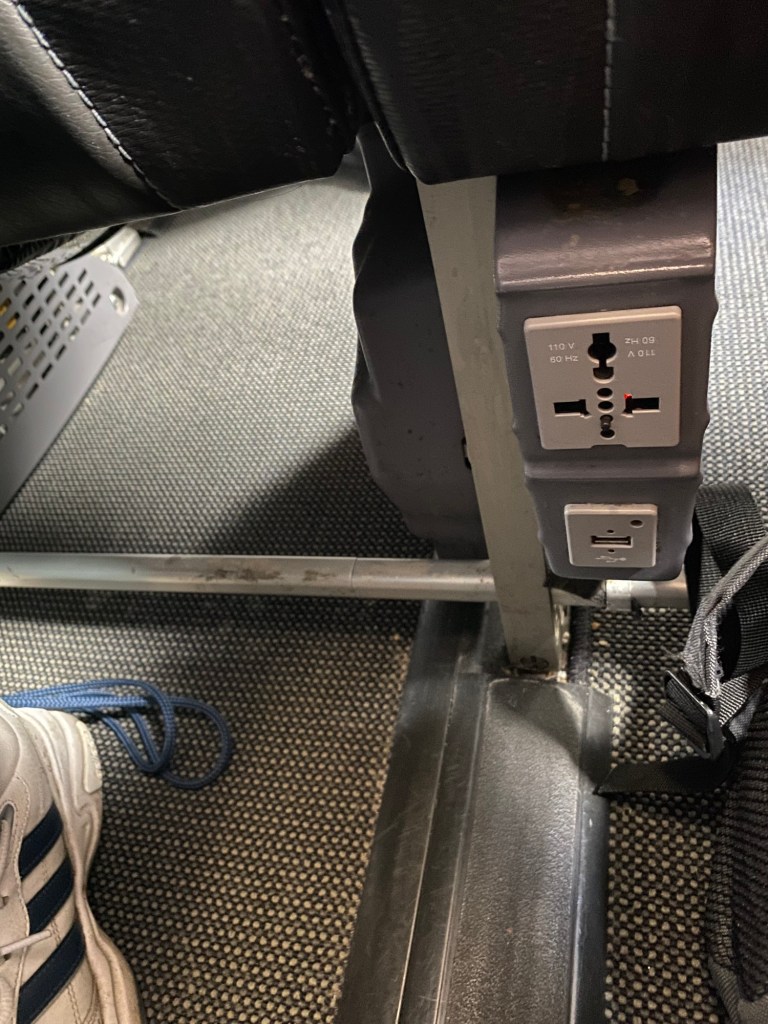 As soon as we boarded we could feel the plane was very warm inside, despite it being an overcast and rainy day. We took our seats in one of the front rows of the economy class cabin. They where the same comfortable leather seats with an adjustable headrest as on our flight from Brussels to London. The main difference being that the neo offered a full 110 volt power plug besides a USB plug to charge your electronics, located under the seat.