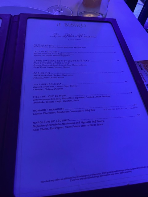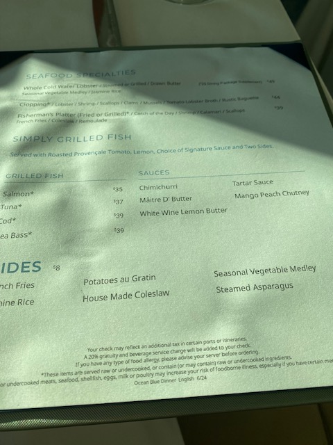 All the main dining rooms offer the same menu. We dined once at Savor, our only main dining room dinner. The menu offers a mix of meat, fish and vegetarian. Items you can have every day and items which change every day.