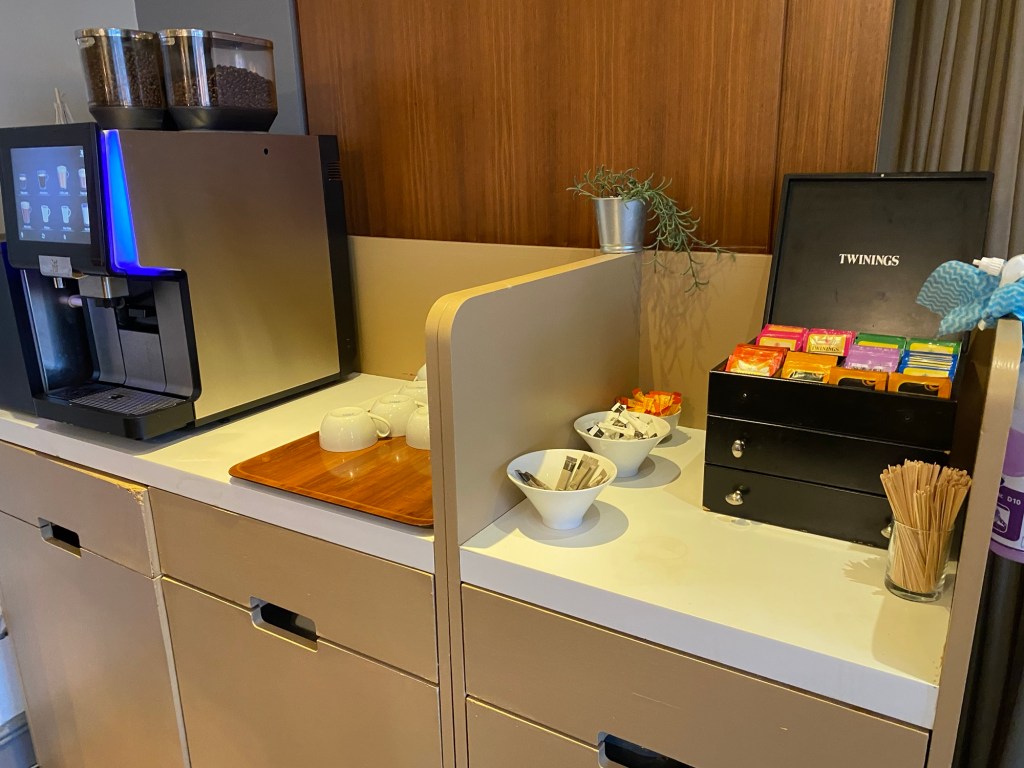 The room had a double bed in the middle of the room, with the typical old-style Novotel hard mattress. Only one side of the bed had a 230v AC power plug. The sofa was also made up as a fold out bed, we folded it back up to use as a sofa. Opposite the bed was the desk with a swivelling part to be used as a dining table for room service. In the entrance corridor was also the closet to store stuff as well as the mini-fridge with complimentary water and kettle for tea and instant coffee.