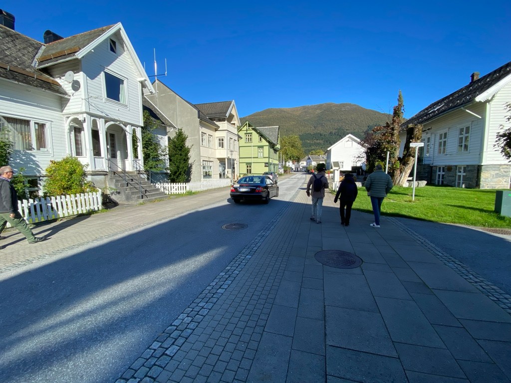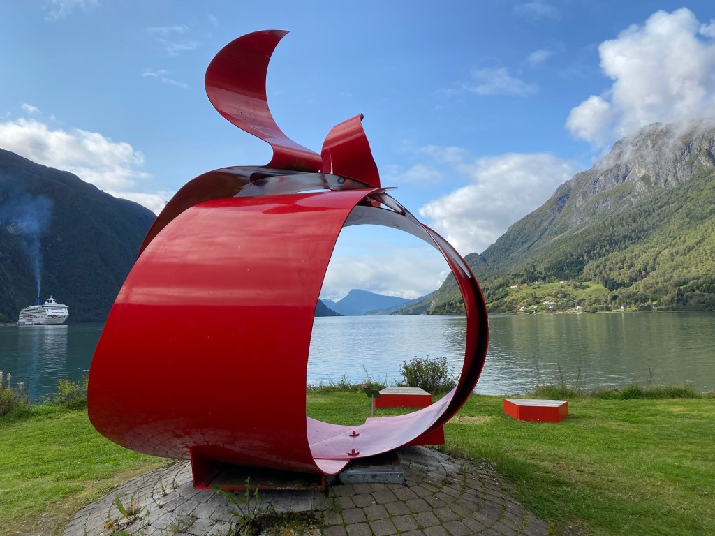 The town was quaint with wooden houses and the replica of a Viking ship on display. There was also a piece of modern art overlooking the spectacular scenery of the fjord.