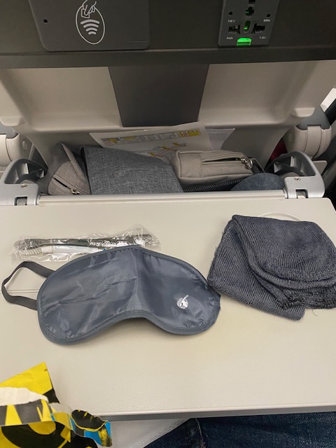 The seat itself is comfortable, offers a decent recline and decent legroom. We even received a mini amenities kit featuring a toothbrush plus paste, an eye mask and socks. Nice.