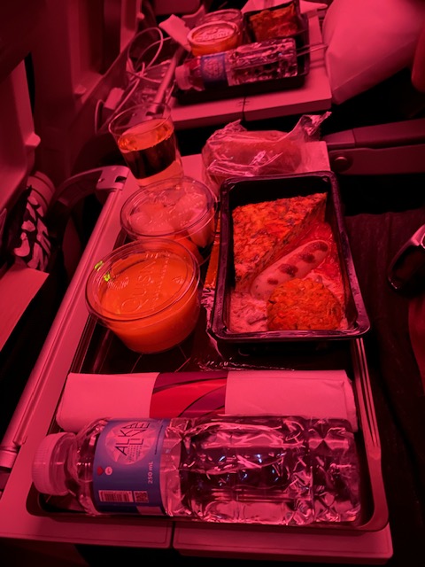 Taking off at 2.40 AM, the catering service started swiftly. No drinks first, but immediately a ‘breakfast’, where Oriol chose omelet and sausage and I went for an apple strudel.
