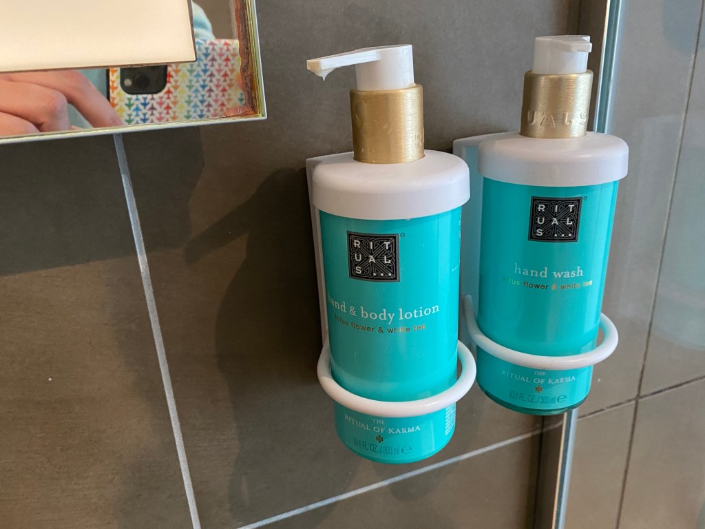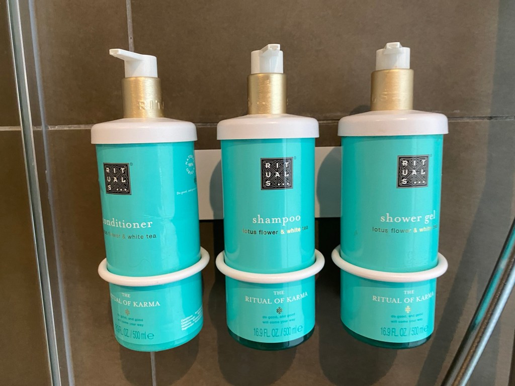 The bathroom had a toilet, a sink in the middle and a spacious rain head shower on the other side. In between the shower and the bedroom is a frosted glass wall, which you normally can turn on and off to make it see-through or opaque. However the button in our room was broken (luckily) leaving it in opaque state. Plenty of towels, bathrobes and slippers and Rituals products where provided.