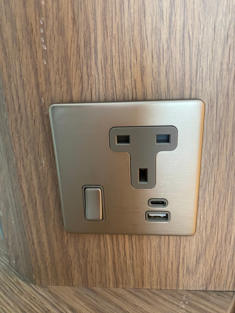 In the middle of the room there was the double bed, which in our opinion could have been placed a bit further away from the bathroom wall as that would have filled the room better. The bed had 240V AC Uk plugs, USB-A and USB-C plugs at both sides.