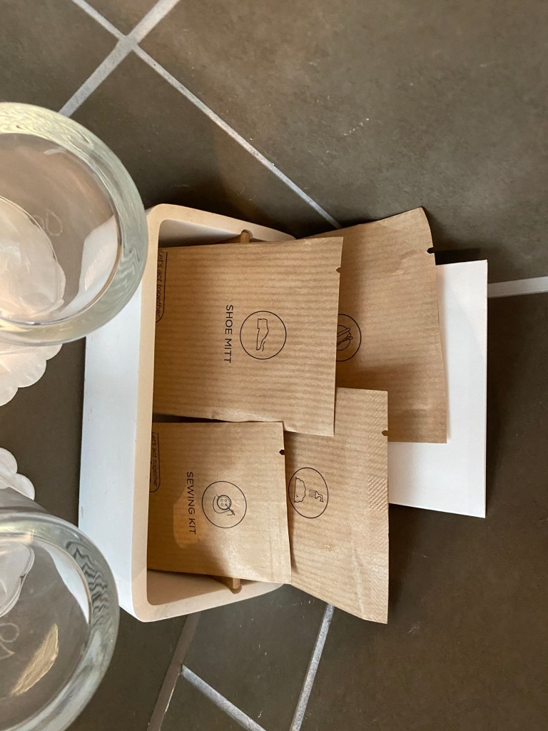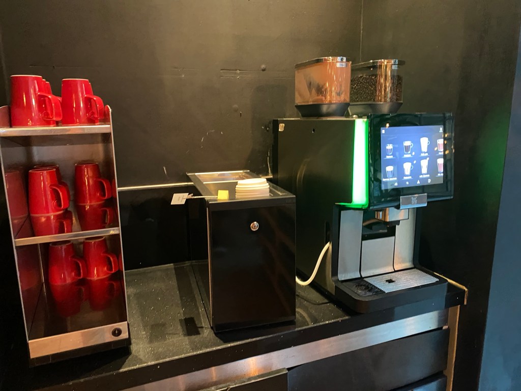 In the entrance corridor there where some closets and a bag storage rack. Here we could also find the mini fridge with complimentary water bottles (still and sparkling). The water kettle with teas and a coffee pod machine for coffee. However as the hotel ran out of normal coffee pods, they only had decaffeinated pods.
