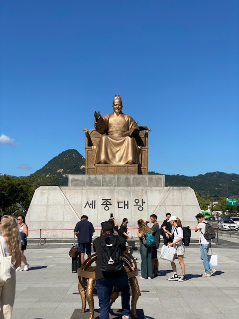 The Statue King Sejong, a bit further, commemorates King Sejong the Great (세종,1397-1450, reign 1418-1450), the fourth king of Joseon (1392-1897). He is thought to be the greatest king in Korean history, for he is credited with great developments in science and technology, expansion of Joseon’s territory, and the creation of the Korean script, Hangeul. King Sejong’s portrait can be found on the 10,000 won bill as well.