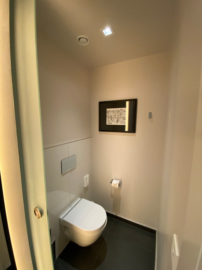The main part was located towards the room with big sliding doors closing it off from the hallway. It contained a nice big bath, if I was travelling with Sam this would have been the perfect spot to enjoy a romantic bath together. In the middle there was a nice big sink and to the other side the rain shower, which didn’t leak into the room.