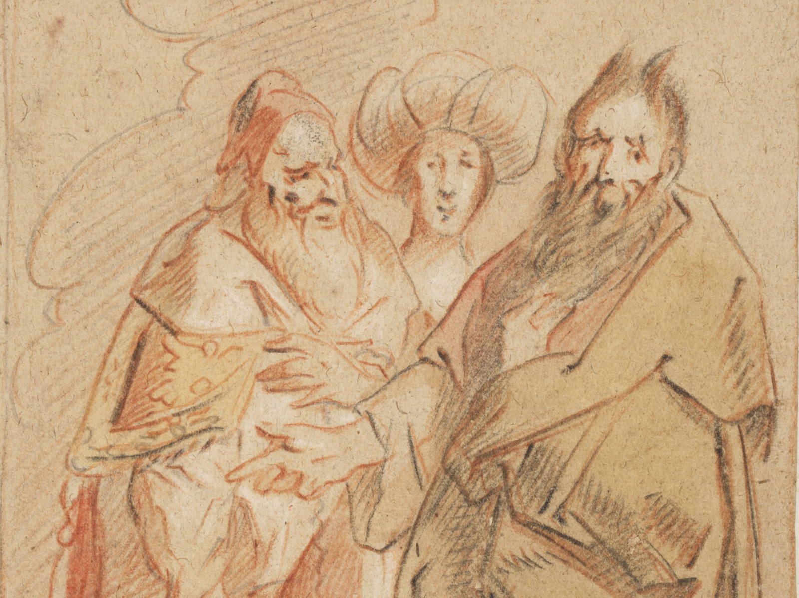 The connection between the sketch and the painting is not immediately apparent: the compositions differ greatly from each other. Yet there are striking similarities. On the right of the drawing, we recognise Moses. His horns, like stubborn tufts of hair, are visible in the painting. Also note his frown, sharp nose, red cheek and dark beard. Even the hand gesture and the folds of his robes are related.