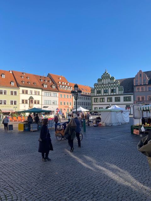 It looks like Weimar was spared from heavy bombings in WW II, as many old buildings remain. Weimar looks much more charming and lively than Dessau, our previous stop. There were more tourists as well. We heard a lot of French. One Française was complaining (to me?) about spoiling het photo. Well, be faster, you’re not alone.
