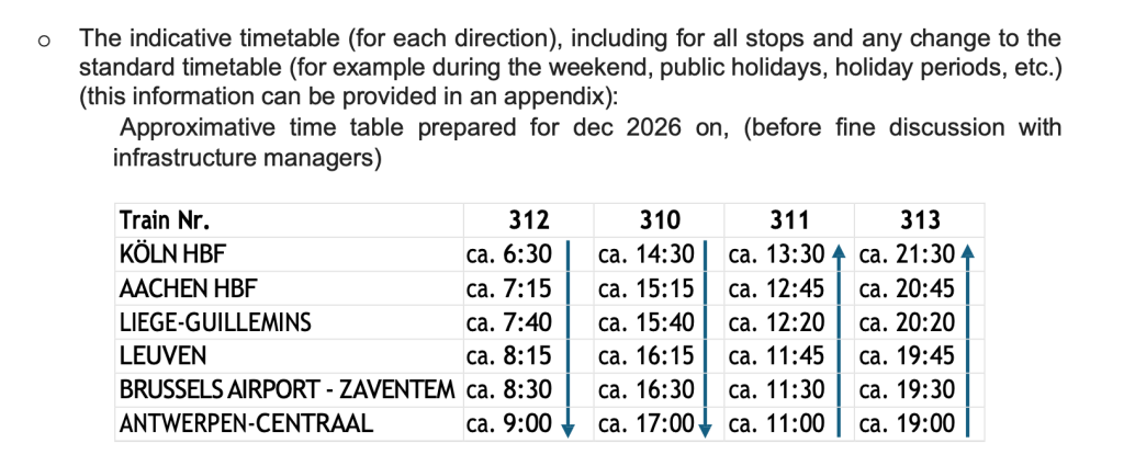 “The new connection is scheduled to run twice daily in both directions from September 2026, according to the application”, Belga writes. On the pdf, we read December 2026. December makes sense because it’s the ‘Railway New Year’ for timetables in Europe. But this document does say 7 September 2026.