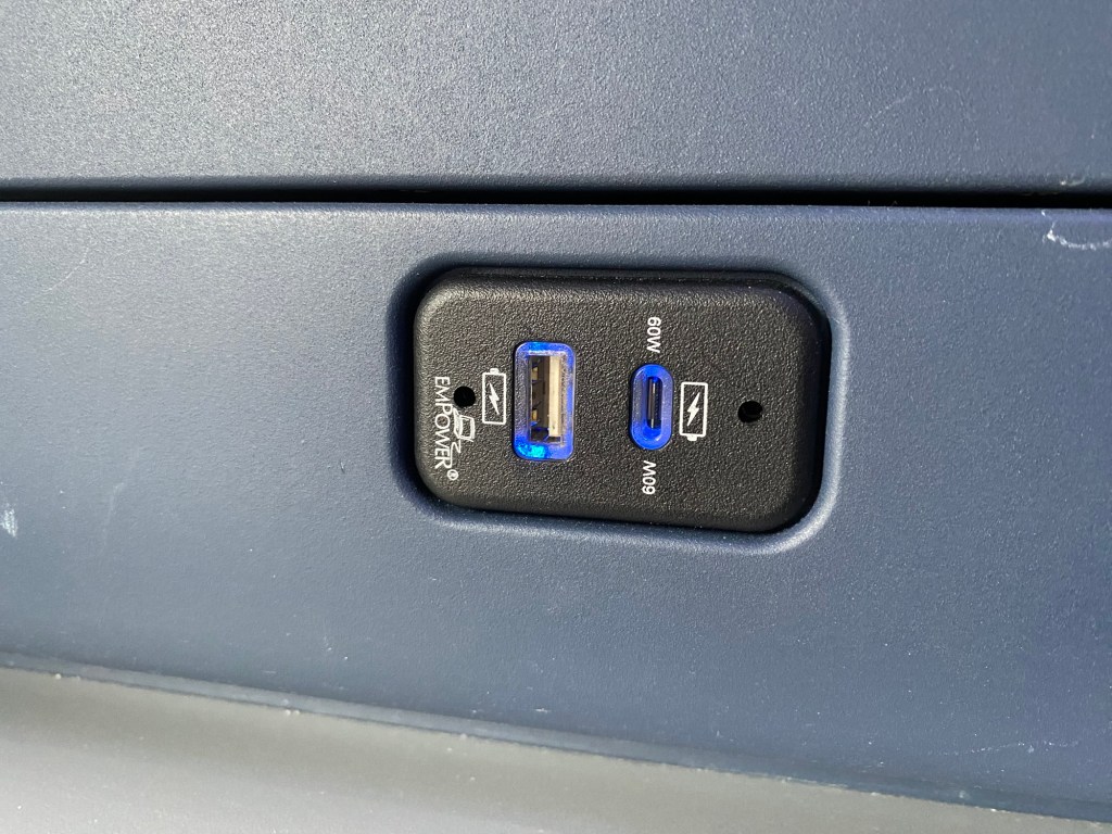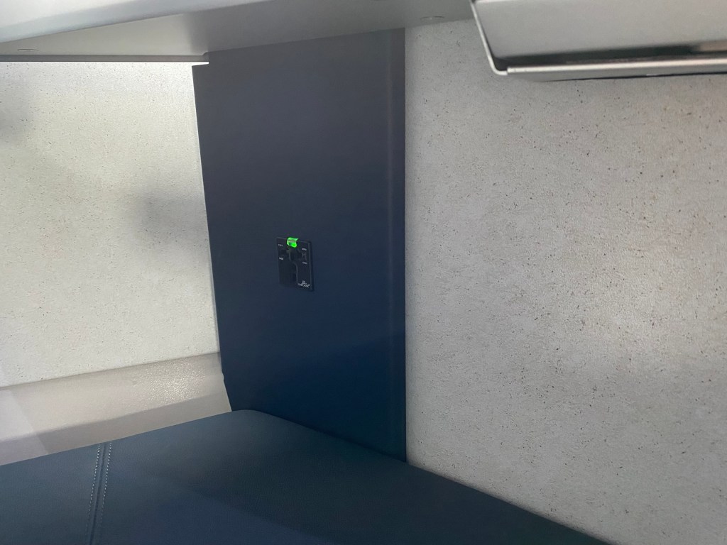 In the side console there was a closet useful to store some items and this is also where you could find the headphones. The seat also had USB-A charging, 60 watts USB-C charging and a proper 110v outlet.