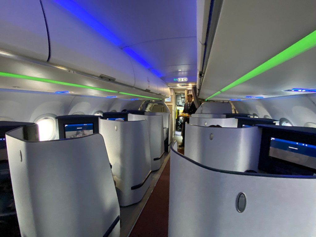 Upon boarding the plane Timothy spoke to me with utter surprise “this is not the seat I was expecting” and indeed we could see long-haul style lie-flat seats in a 1-1 configuration on-board the plane. Turns out ITA Airways ‘upgraded’ our flight to one of their new A321neo’s used on longer single aisle flights like Cairo and Tel Aviv and thus equipped with a more comfortable and spacious long-haul style cabin. Featuring 1-1 lie-flat seats in Business, followed by a few 2-2 rows of premium Economy before the usual 3-3 Economy seating.
