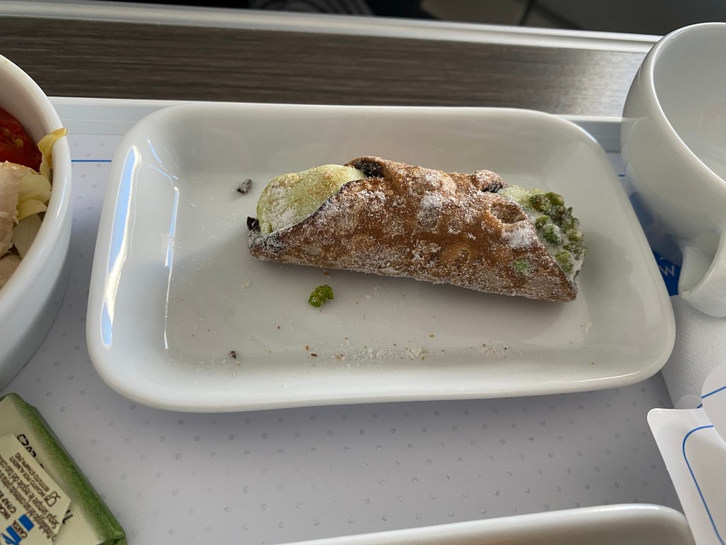 The meal consisted of a Caesar salad with a generous serving of cheese and chicken, the main was a warm margarita pizza and for the dessert a typical Sicilian pistachio cannoli. On the tray was also a hot bun, butter, olive oil and pepper and salt. The metal cutlery still contained the engraving of Alitalia.