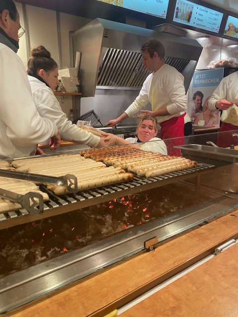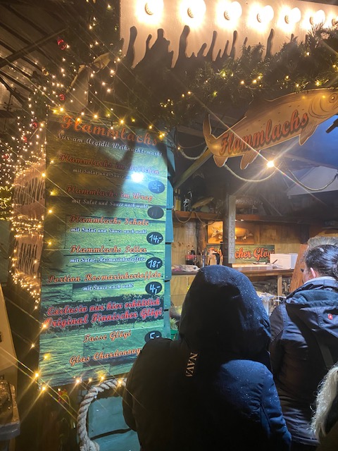 It was again really crowded and raining. Yet we had dinner standing up, reckoning sit-down restaurants would be full. So we started with Flammlachs or flame-grilled salmon on a bun. Then we had Balkanwurst or Balkan sausage. Basically a Bratwurst with a ‘Balkan’ sauce. While Dennis followed up with some sweet roasted almonds, I had bowl of ‘carbonara’ potatoes. Potatoes, with hollandaise sauce, ham and cheese. Very tasty.