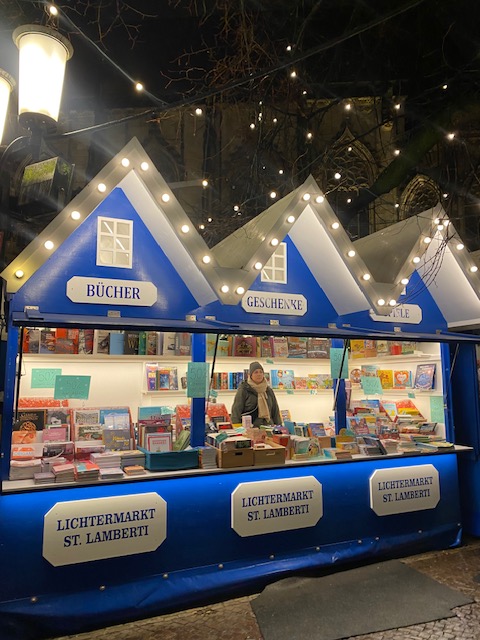 “At the foot of the mighty St. Lamberti-Kirche, the little blue huts of the lights market create a special sparkle. Surrounded by magnificent gabled houses, the Christmas decorations and Münster’s largest Christmas tree compete in a bid to outshine one another.”